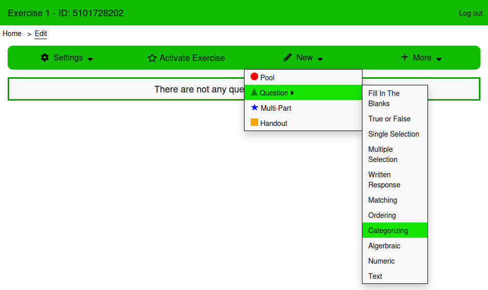 The answers in this question type belong to categories that are written in the Categories table. A Categorizing question can have any number of categories. Each category can have a limit to how many answers fit in it. To have the category be unlimited, leave the limit input blank.