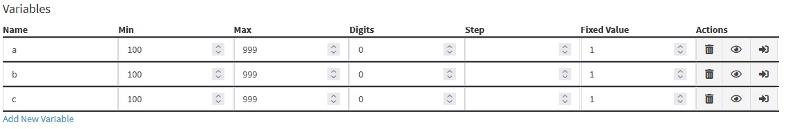 Go to the Variables table and create three variables, called “a”, “b”, and “c”, each with a Min of 100, a Max of 999, and Digits of 0. All three will be three digit random integers that can differ from each other.