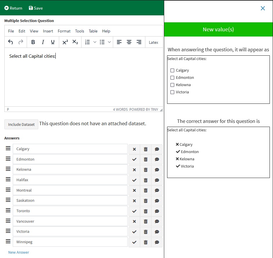 The Question text for this example is “Select all Capital cities:”. The answers are: Calgary, Edmonton, Kelowna, Halifax, Montreal, Saskatoon, Toronto, Vancouver, Victoria, and Winnipeg.