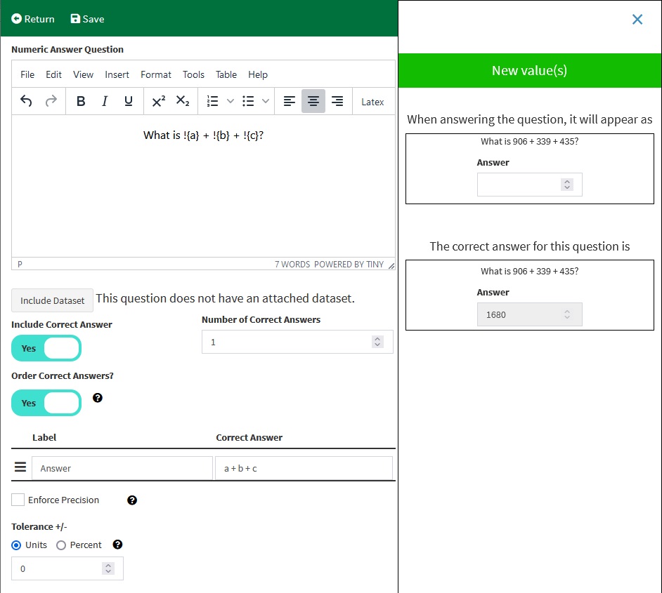 Set the text in the Numeric Answer question input to “What is !{a} + !{b} + !{c}?”. When displaying the question, EduRITA will find the patterns !{a}, !{b}, and !{c} and replace them with the variables a, b, and c respectively. To put any variable or formula in text that will be displayed, write down its name surrounded by !{ and }.